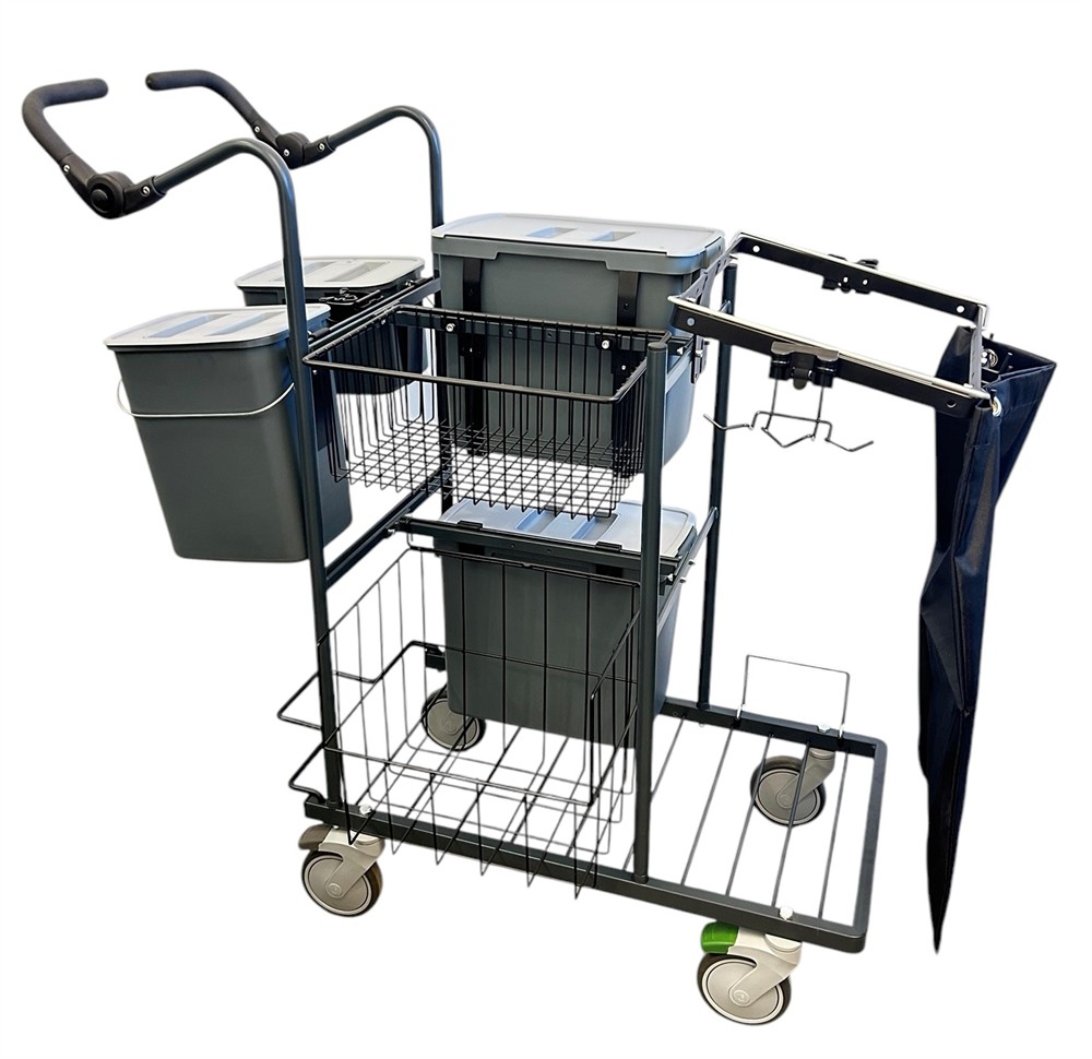 Activa 747 serien är tillverkad i Sverige med återvunnet stål och konstruerad för hållbarhet och funktion in i minsta detalj. Med detta funktionspaket får du en funktionell standardutrustning för städning med förprepareratstädmaterial. Vagnen passar ett mellanstort städområde. Plastbackarna är av återvunnen plast i tre olika storlekar. Locken till backarna är enkla att ta på och av och har krokar för upphängning när det är aktivt läge. Vagnen är utrustad med följande funktioner: Duk/mopp hink 7Loch 12Lmed snabblock. Mopp/material back 25L med snabblock x 2. Materialkorg XL ca 35L+ Materialkorg Stor ca 18L. Tvättpåse 33L. Totalt 2st redskapshållare Pro med stativstöd. Smart hållare för sopset. Tröskelklättrare.