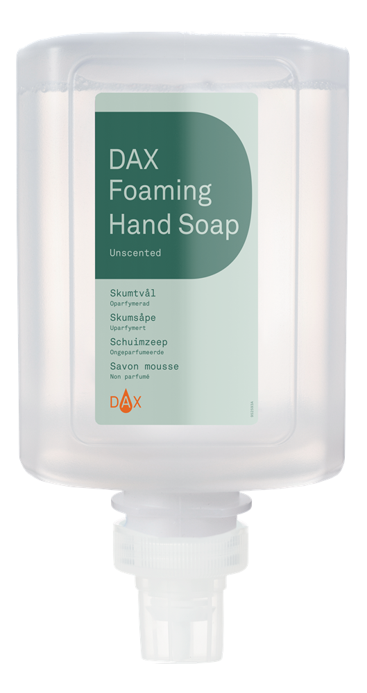 DAX Foaming Hand Soap är en mild och hudvänlig skumtvål i refillförpackning till DAX SMART automatiska dispenser och DAX EASY manuella dispenser. Skumtvålen är oparfymerad, vilket gör den lämplig för alla hudtyper. Oparfymerad skumtvål som rengör huden varsamt och efterlämnar en fräsch känsla. Tvålen är dryg i användning då en flaska räcker till 1000 doseringar. Genom att använda DAX Foaming Hand Soap ihop med DAX SMART automatiska dispenser får man en optimal hygien. Produkten är lämplig för offentliga toaletter, på kontor och arbetsplatser samt inom HORECA-sektorn.