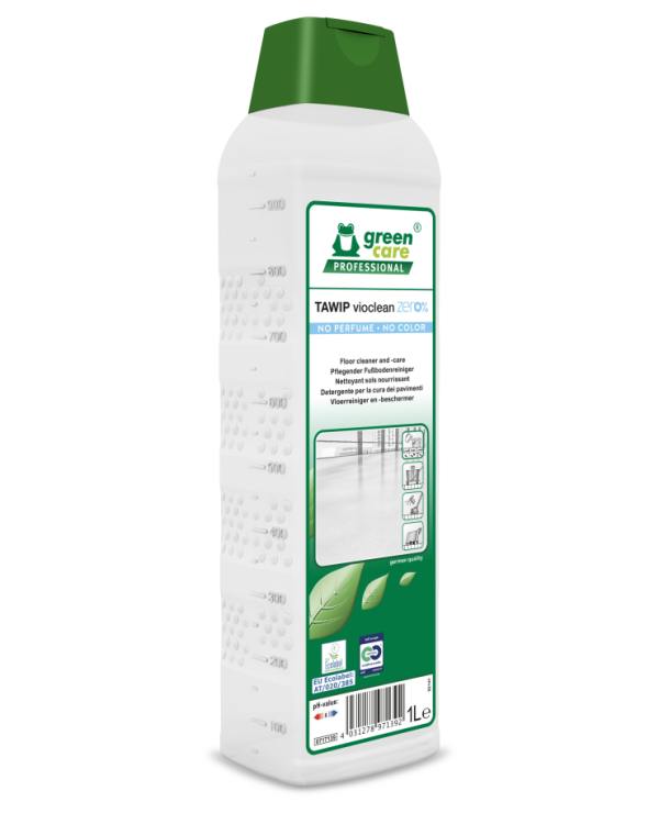 TAWIP vioclean zero% är ett golvrengöringsmedel med extra vårdande effekt och enastående miljöegenskaper utan att innehålla parfym eller färgämnen.Tar hänsyn till biologiska cykler, värnar om människors hälsaoch städpersonalens säkerhet. Samtidigt som den förbättrar arbetssäkerheten, säkerställer TAWIP vioclean zero% perfekta rengöringsresultatvid låga koncentrationer. Den naturliga tvålen av kokosfett i sammansättningen skyddar golvet från urlakning och lämnar enskyddande film med antistatisk effekt, samt minskar halkrisken i överensstämmelse med DIN 18032-2.