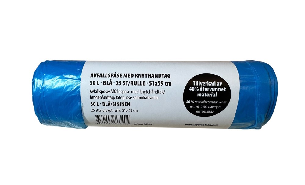 Avfallspåse med knythandtag. 30 liter, blå, 51x59 cm. Tillverkad av 40% återvunnet material.